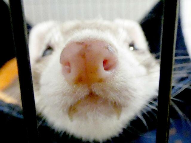 こちらはフェレットの鼻に、レンズの焦点距離を最も短くした状態で2cmくらいまで近づいて撮影したもの。ピンクの鼻の中に実は茶色い模様があるのがわかりました!
