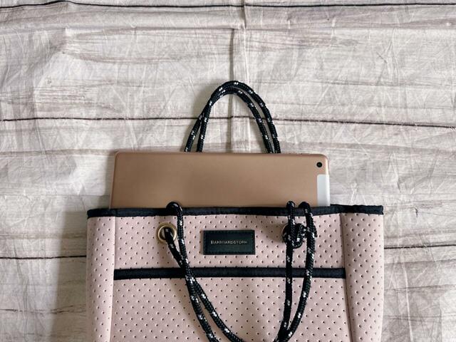バンヤードストームのウエットスーツのようなパンチング加工素材が夏らしいトートバッグは、人気アイテムをリデザインしたもの。2WAY仕様のストラップ&絶妙なサイズ感、大人かわいいニュアンスピンクカラーも推しポイントです。
