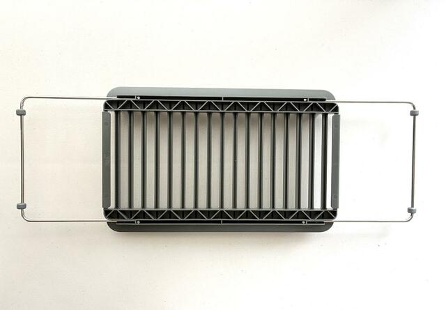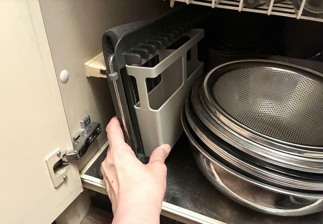 が、この「オーバーザシンクドライングラックウィズマット」は、まるっとコンパクトにまとまるので、使わないときにはシンク下のスキマに収納できるようになりました。