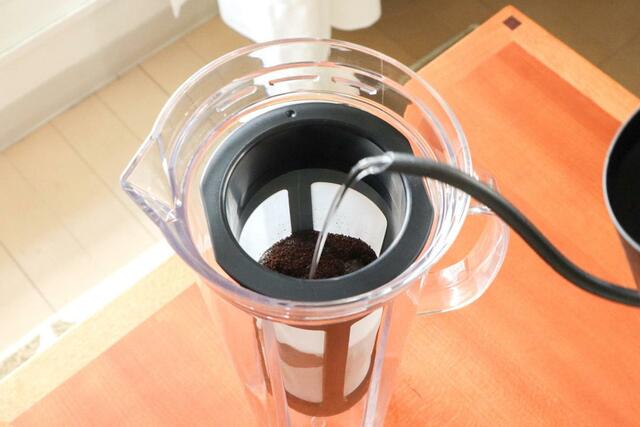 あとはコーヒー粉全体が湿るように、水を少しずつ注ぎいれます。