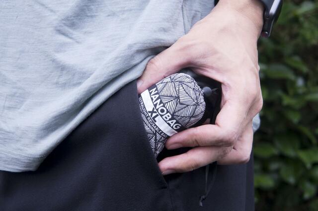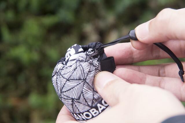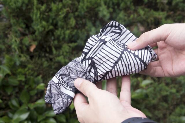 生地が薄く柔らかいので、折りたたまずに袋に押し込んでいくようにすれば簡単に収納できるのも「NANOBAG」のいいところ。