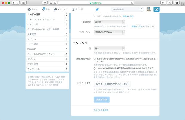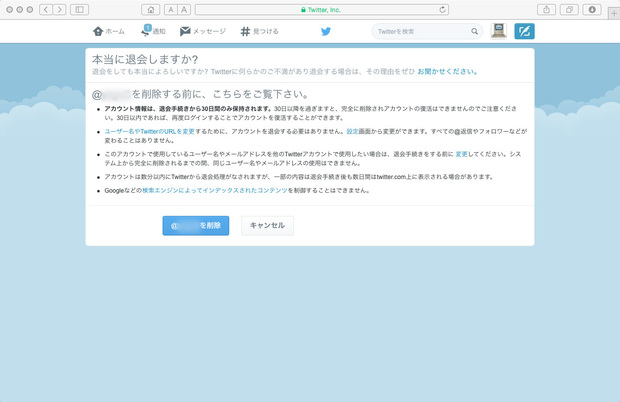 Twitterの辞め方は、Facebookに比べると比較的容易です。まずWebブラウザーでTwitterにログインし、右上の自分のアイコンをクリックして「設定」を選びます。すると「ユーザー情報」が表示されますので、一番下の「アカウントを削除」を選択します。