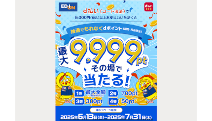 エディオンは7月31日まで、エディオンの対象店舗においてスマホ決済サービス「d払い(コード決済)」で5000円以上を支払うと、抽選で最大全額分のdポイント(上限9999ポイント)がその場で当たるキャンペーンを開催している。