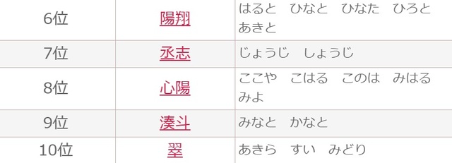 6位から10位にも、太陽を連想させる「陽」の字が入った、ぽかぽかネームが2つもランクイン!