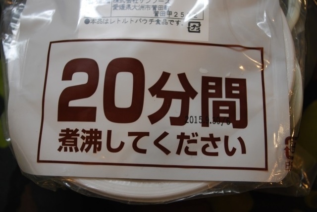 こちらも豚の角煮丼と同じく加賀米のご飯つき。メッチャでっかく「20分間煮沸してください」って書いてある。しかも裏にも・・・それでもって、「袋から出してから」とか一言も書いていない。もしかすると、このままでっかい鍋で温めるのが自衛隊流かも?
