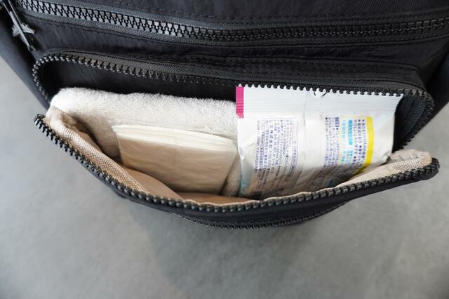 ここはマチがあるので、タオルハンカチやティッシュなど、厚みのあるものを入れるのがよさそうです。