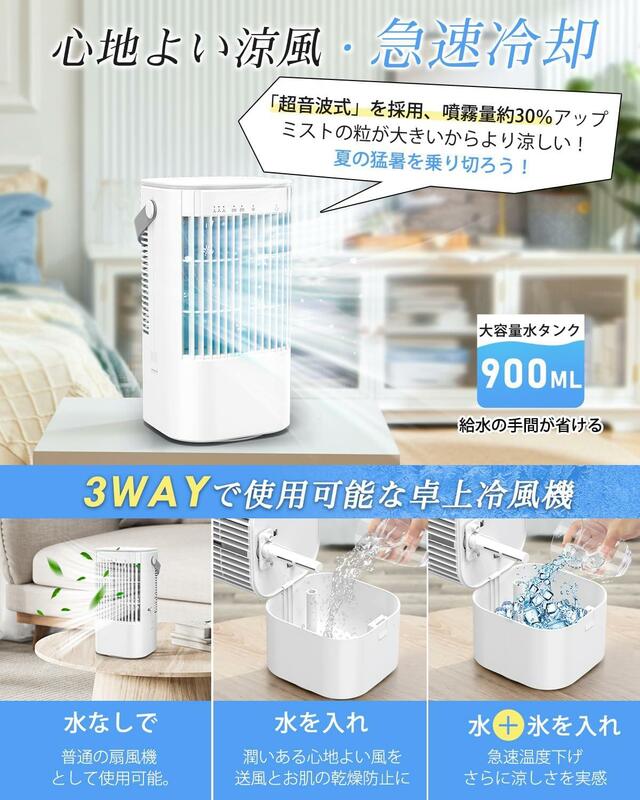 900mlの大容量水タンクを搭載し、水だけでなく氷も入れられるので、より涼しい風を感じることが可能。超音波式でミストの粒子が大きくなり、冷たさを体感しやすくなっている点もポイントです。