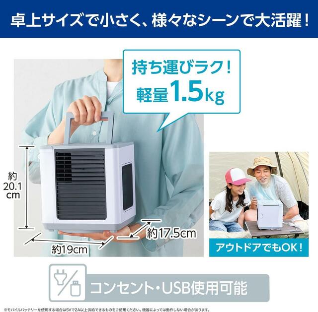 特許取得の独自冷却技術を採用し、気化熱現象を利用して空気を効率的に冷やします。軽量コンパクト設計で持ち運びも簡単なうえ、コンセントとUSBの両方から給電可能なので、場所を選ばず使用できます。