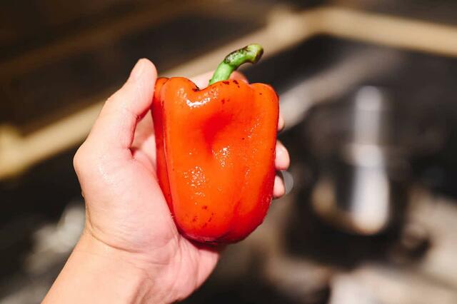 実はパプリカには薄皮があるのですが、包丁やピーラーではうまく剥けません。コンロの直火で炙ったり、オーブンでローストしたりして、皮だけを焦げすことで剥くことができるんです。