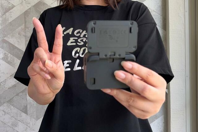 フリップ式のスクリーンを立ち上げて画角を確認したら、カメラに向かってピースをすれば勝手に撮影準備が始まります。
