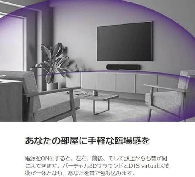 前後左右の広がりに加えて、天井からの音までをバーチャルに再現する技術で、単体のサウンドバーながら立体的な音場を創り出します。