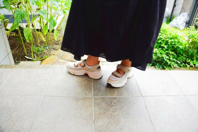 面ファスナーのストラップなので着脱しやすく、この時期はスニーカーよりも蒸れにくいのも◎。靴下と合わせればオールシーズン使うこともできます。