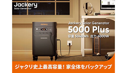 Jackery Japanは、6月30日からJackery史上最大容量の「Jackery ポータブル電源 5000 Plus」を販売開始した。5040Whの超大容量と定格出力6000Wの高出力を実現し、最大5台の拡張バッテリー(5040Wh)に対応することで、最大3万240Whまで拡張可能。工事が不要で、タイヤ付きのため、日常使いや災害時の非常用電源として、様々な場所で手軽に使える。