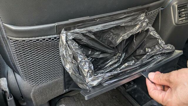 前の座席の人は後部座席に人がいれば捨ててもらえますが、そうでなければ真後ろではなく斜め後ろに手を伸ばして捨てるのがよさそうです。