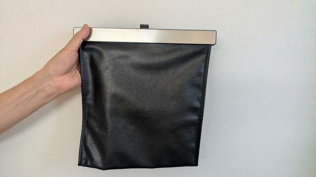 フェイクレザーのバッグのようなデザインの、吊り下げ式ゴミ箱です。