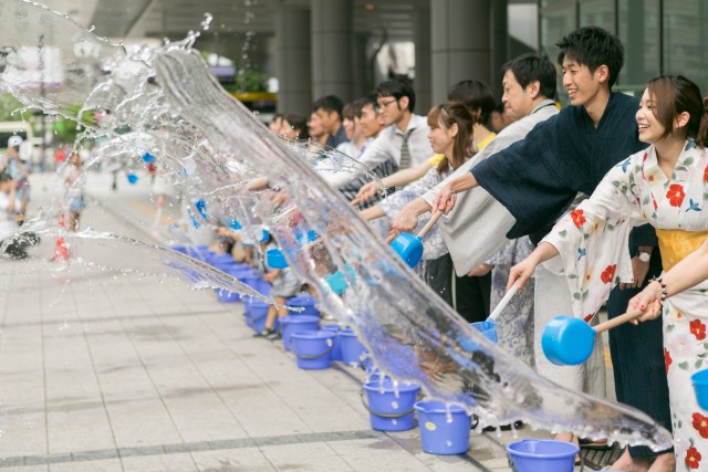 連日の猛暑で、夏バテしている人も多いはず。ひんやりとした打ち水で、梅田を涼しく過ごしやすい街にしましょう!