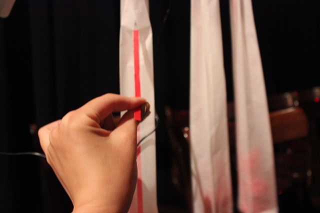 棒に縦長の紙袋がぶら下がっています。赤いテープを引っ張ると、中からチョコレートが。紙を破るような音を表現したお菓子です。柔らかなトリュフチョコに、甘いような、酸っぱいような、不思議な味のパウダーがかかっていました。
