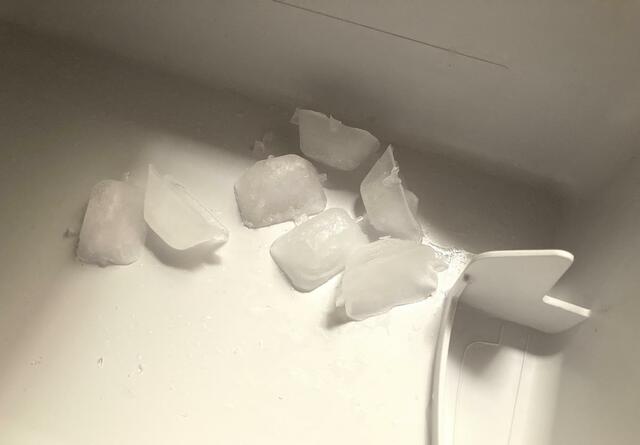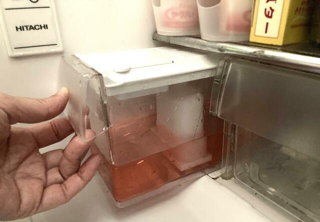 製氷機内部に残っていたクリーナー入りの水と、後からすすぎ用に入れた水道水でツートンカラーになっています。