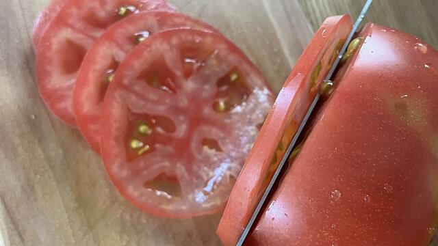 力が効率よく伝わるから、やわらかくて潰れがちなトマトもこの通り薄〜くスライスできるんです。