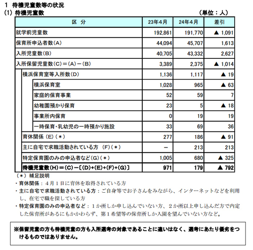 そして待機児童数の数え方だが、まず「保育所」の入所申請をする、というのが前提となる。その中から入所できていない人を「入居保留児童数」として算出。これは認可保育所の入居保留児童数で、ここから認可外保育所に入所した児童数や、どちらかが育児休暇中や育児休暇延長が可能な状態の親、インターネットなどを利用して自宅で求職活動をしている親、特定の保育所のみに入所申し込みをして待機しているなどの親の児童の総数を引いた数が「待機児童数」となる。