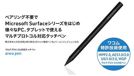 「aiwa pen」は、ワコムの「アクティブES(AES)」によって複数のプロトコルに対応しているため、Microsoftの「Surface」シリーズやChromebookをはじめとする、さまざまなPCやタブレット端末で使用できる。