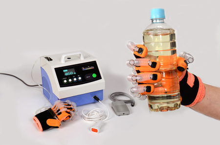 空気圧を利用し、まひしている手の甲側に蛇腹の付いたグローブを装着してもう片方の手でスイッチを押すと、空気圧によって手が開閉するようになる。