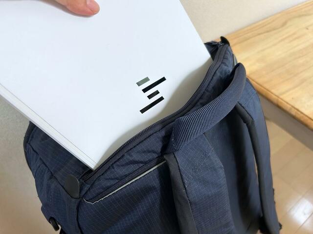 背中側にはノートPC用のポケットがあって、クッションも入っているので安心です。PCを入れると荷物が少なめのときもスクエアの形がピシっと整います。