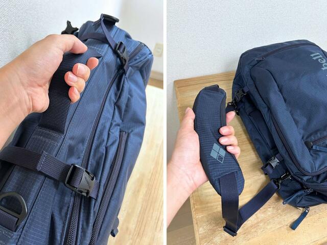 ちなみに手さげやショルダーとして使う場合は、肩ベルトをしまうことができてスマートです。