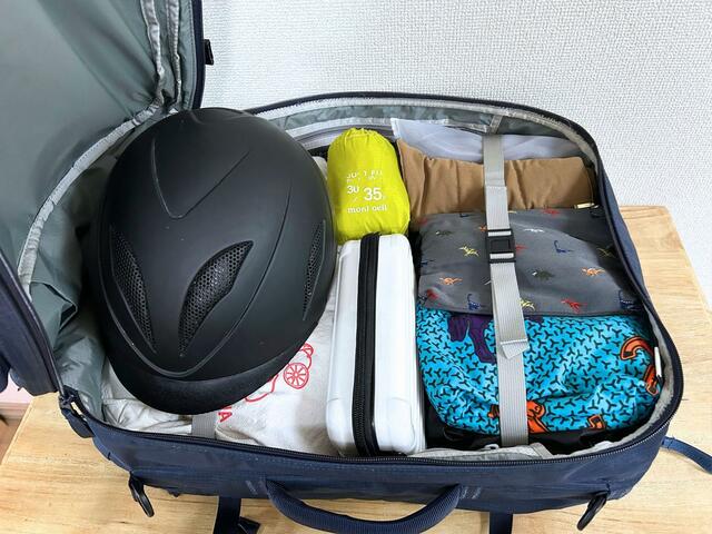 私は旅先で乗馬をするのが趣味なので、ヘルメットなどを持っていくことも多いのですが、このようなかさばるものも無理なく収納できます(ちなみに乗馬用のロングブーツも入ります)。