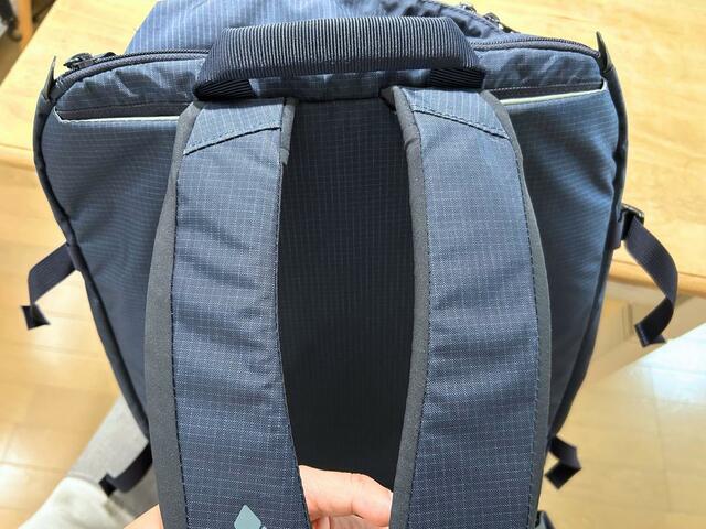 一般的な旅行の荷物であれば問題はありませんが、大量の書籍と一眼レフに三脚に……など重いものを詰め込み過ぎるとせっかくのスクエア型が崩れる原因に。また、チェストベルトが付いていないため、肩に結構な負担がかかります。
