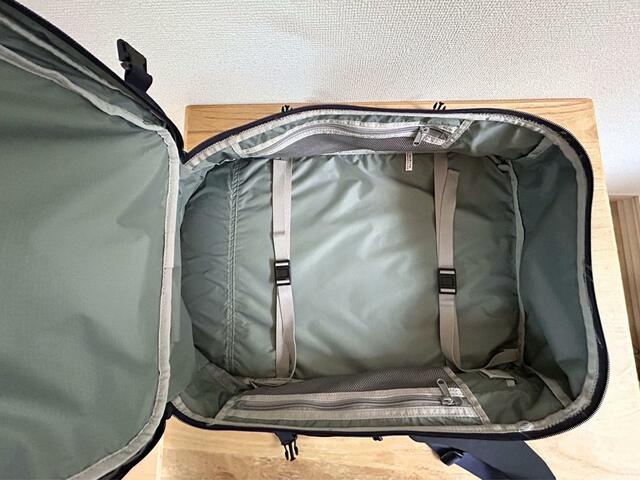 このバッグはキャリーバッグのように、開口部をパカッと全開にして使えるため、中身が一目で把握できて整理もかんたん。縦型バックパックのように、底の荷物を取り出す際のストレスがありません。