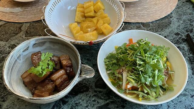 01ベトナム風のなます 02紅焼肉(角煮)+家常餅(餅の中に角煮を入れて食べる。中野妙子、餅作り中です)