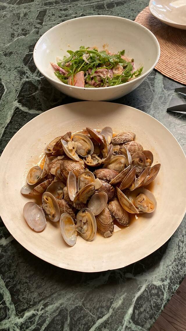 部長のこぐれひでこは[welcomeおつまみ](サラダ、あさりの酒蒸し、焼きズッキーニ)を作っただけ。