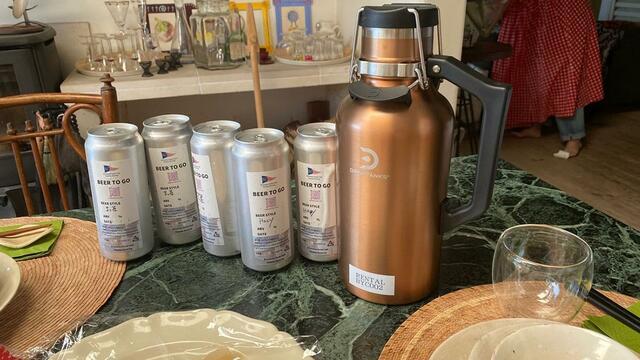 川村玲美が葉山のビール醸造所YACHT CLUBのビールをこんなに持ってきてくれました。大きなタンクに入っているのはマンゴー、缶入りのものは抹茶。これらが美味しいの! めちゃくちゃ爽やかな味わい。