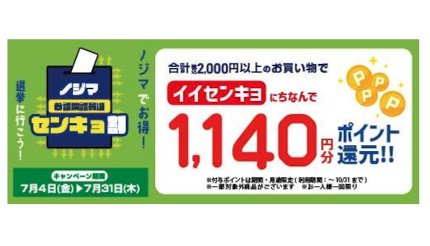 ノジマ、参院選への投票で1140円分のポイントを還元する「センキョ割」を都議選に引き続き全店舗で実施