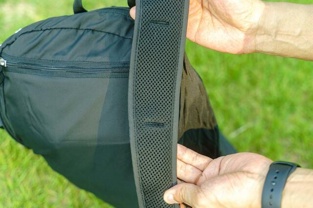 ショルダーストラップには通気性に優れたメッシュ素材が使われており、簡易的ながらクッション性も備えています。