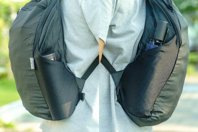 さらに、両サイドのボトルポケットは伸縮性のある深めの設計で、ペットボトルや折りたたみ傘をしっかりと固定でき、安定感も抜群です。