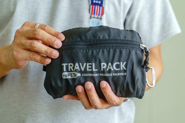 広げてみると、しっかりとしたバックパックタイプ。財布やタオル、水筒、Tシャツなどの着替えに加えて、現地で買ったお土産など、「とりあえず入れておきたいもの」を収納できる容量(15L)があります。