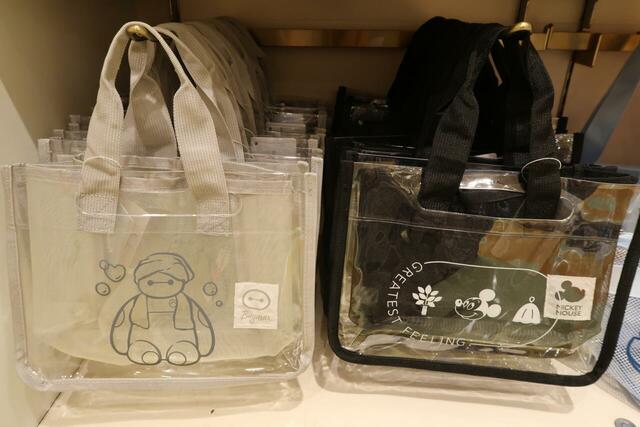頭にタオルを巻いたベイマックスのイラストがかわいいスパバッグは、クリアバッグとメッシュ素材のインナーバッグのセットです。