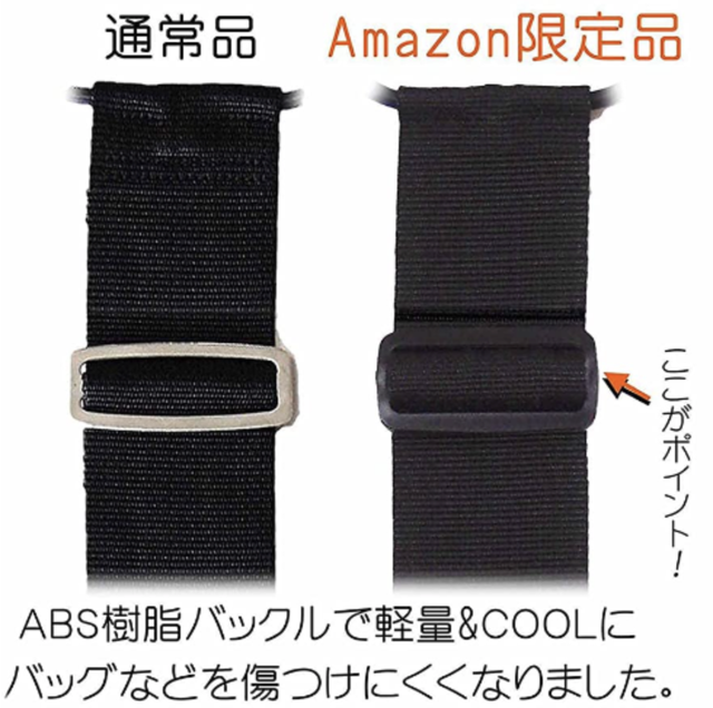 Amazon限定品はバッグに優しい樹脂バックルを採用。バッグを傷つけることなく運ぶことができるのも嬉しいですね。