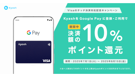 Kyashが運営するデジタルウォレットアプリ「Kyash」から発行するプリペイドカード「Kyash Card/Kyash Card Virtual」は、6月3日からApple Payの「Visaのタッチ決済」に対応した。7月1日からGoogle Payでも同様に「Visaのタッチ決済」に対応し、Apple Pay/Google Payで初めて「Visaのタッチ決済」を利用すると10%ポイント還元キャンペーンを実施している。期間はApple Pay向けが7月15日まで、Google Pay向けが8月15日まで。