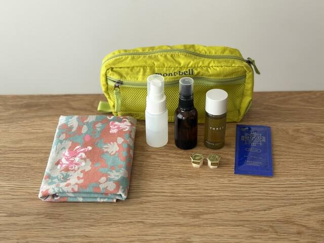 スキンケア用品は小分け容器、備え付けが合わない場合もあるためシャンプーは使用したことのある試供品を活用。