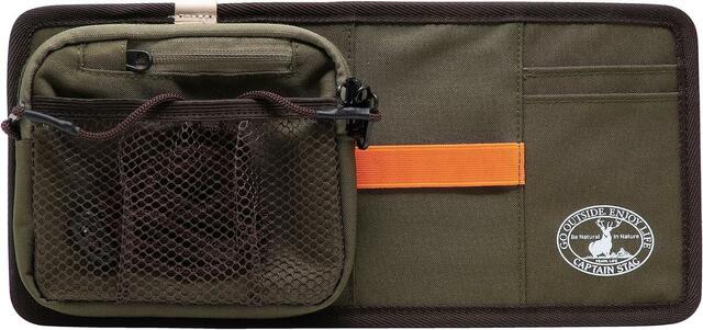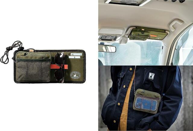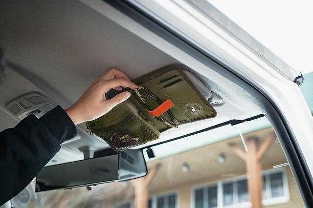 キャンプ用品の人気メーカー、キャプテンスタッグの「サンバイザーポケット」は、これ一つにサングラスホルダー、カード入れ、サコッシュがついており、運転席のサンバイザーに簡単に取り付けできる車内収納ケース。
