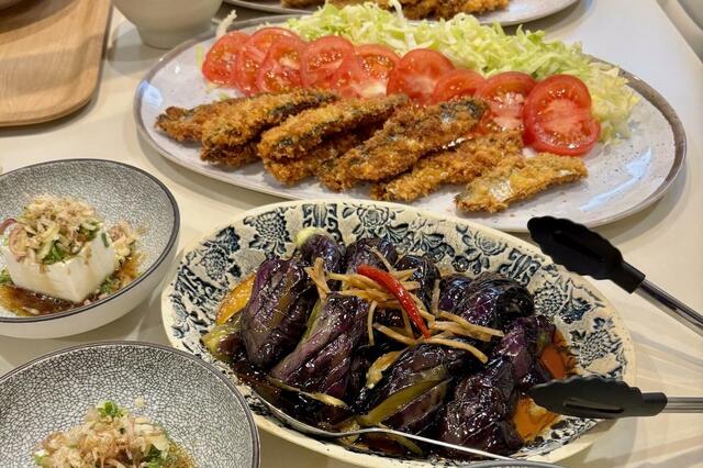 こちらはつい最近のもの。イワシフライ、なすの煮浸し、冷奴と、夏らしいメニューに。サラダ、お味噌汁もおつけしました。