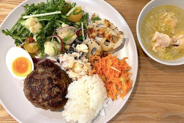鉄板のハンバーグをメインに、カリフラワーと水菜のサラダ、レンコンのスパイスソテー、キャロットラペ、きくらげ入りポテトサラダ、ゆで卵、チキンスープ。