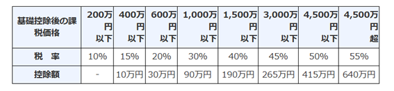 基礎控除後の金額(課税価格)に応じて、税率と控除額が適用されます。