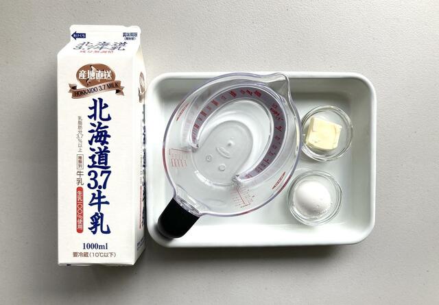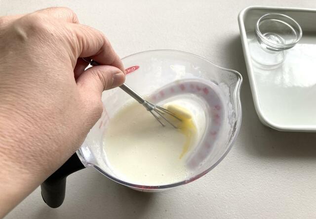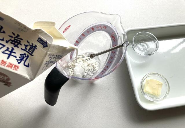 まず、メジャーカップに小麦粉を入れます。ここに牛乳を少しずつ注いで、小麦粉がダマにならないようによく溶いてください。