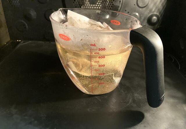 次に出汁パックを入れて、600Wのレンジで4分30秒~5分加熱。