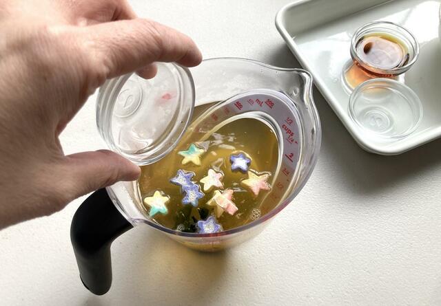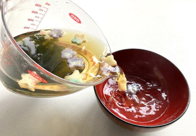 乾物が戻るまで軽くかき混ぜたら、たったの5分で、しっかり出汁の効いたお吸い物が完成!