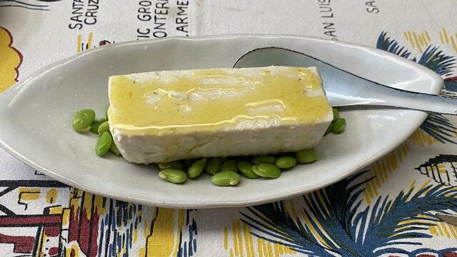 だだちゃ豆腐と枝豆と塩とオリーブオイル(友房家では豆腐とトウモロコシを混ぜ混ぜして食べる、美味しいよ!というので枝豆でやってみた。ほんとだね、美味しい)。